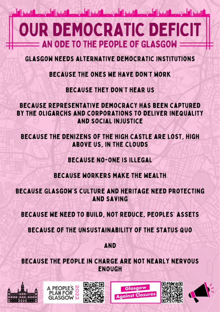 On 14 January, we hosted a short session as part of the Glasgow Against Closures Gathering for Growth and Solidarity – the follow-up session to the Summit on Ownership and Democracy held in November 2022. Our contribution introduced the possibilities for People’s Assemblies for Glasgow that we have been exploring with organisers and volunteers from Ubuntu Women Shelter, GalGael, Enough! Degrowth Collective and more.